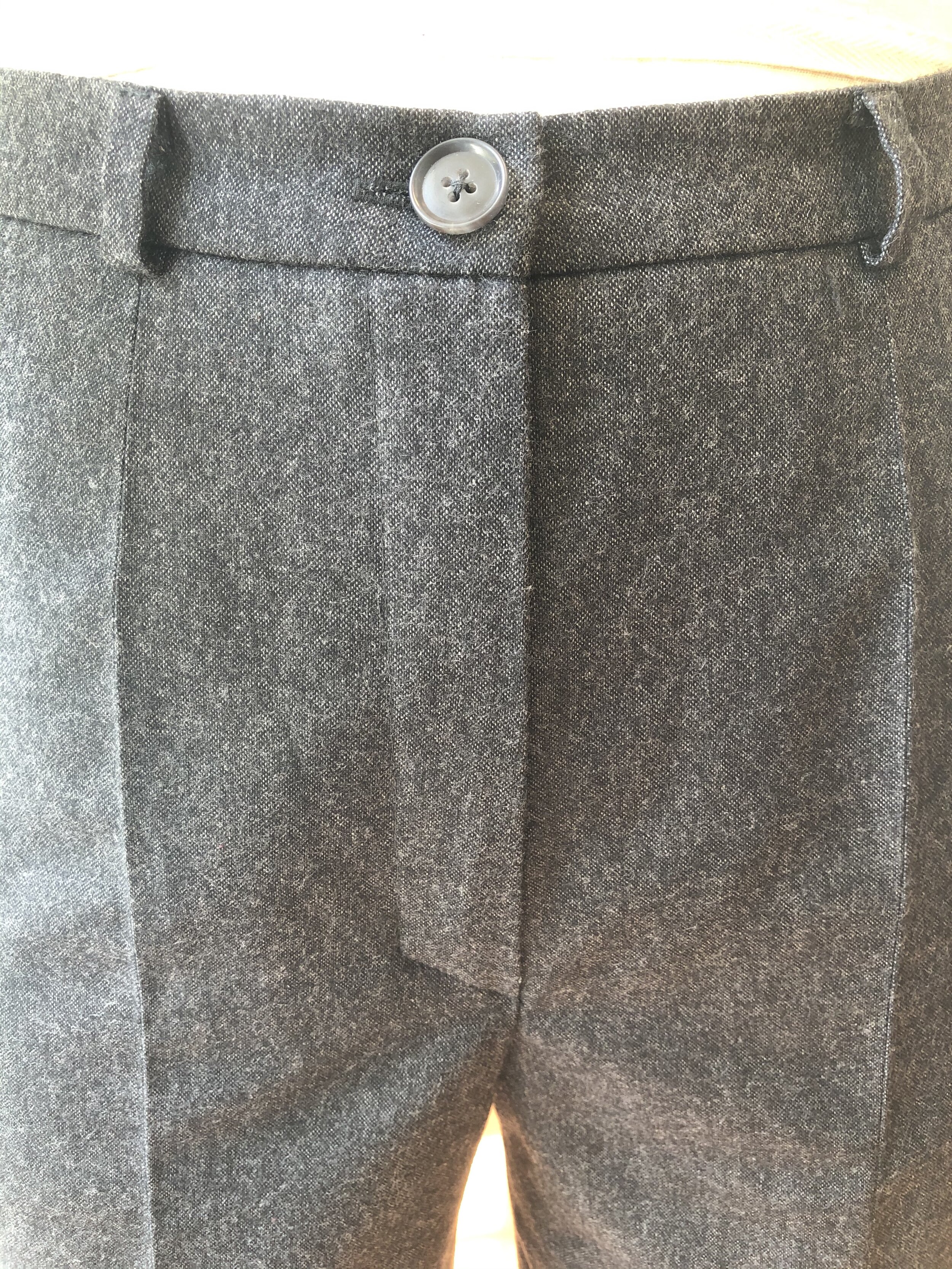 These trousers are made of 100 % wool fabric. The trousers were first made to measure to a model , but then were tailored to a dummy. The model did try on the trousers later on. In these trousers can be found , a fly , bound pockets, split at the front of the legs. The trouser seams are finished with biais tape ( made from the same fabric as the lining ( acetate fabric.)).